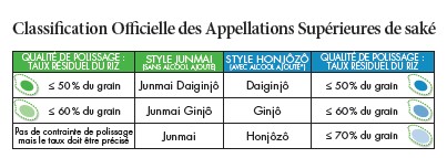 L'appellation Ginjo correspond à un taux résiduel de riz après polissage inférieur à 60% (ce qui reste) mais aussi à une fermentation lente à basse température permettant le développement d'un arôme caractéristique de Ginjo.
